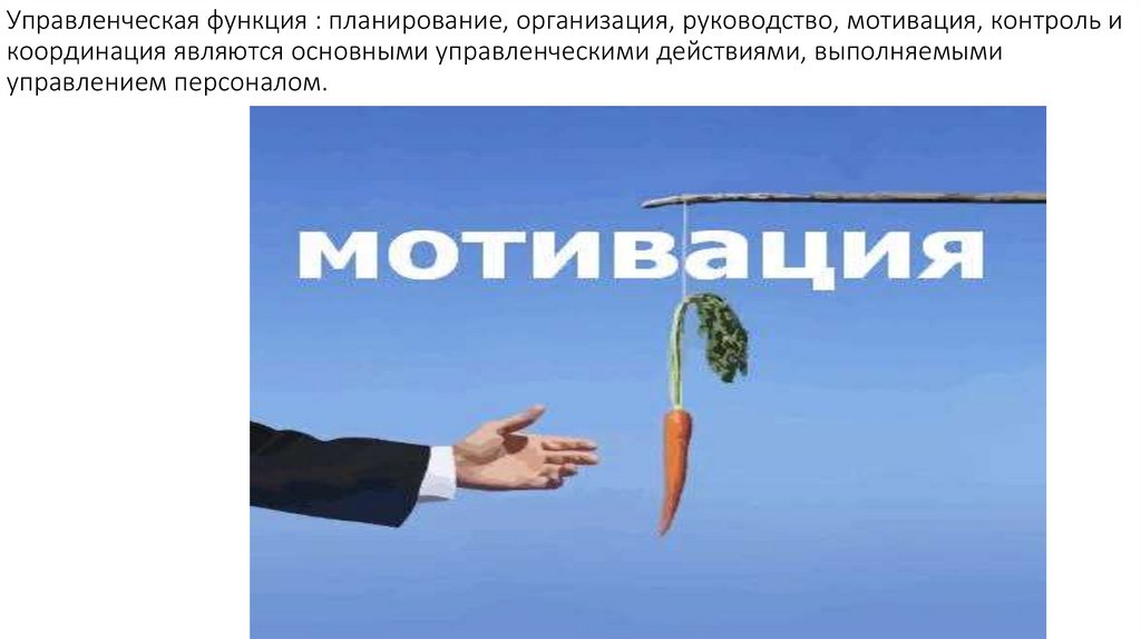 Управленческая функция : планирование, организация, руководство, мотивация, контроль икоординация являются основными управленческими действиями, выполняемыми