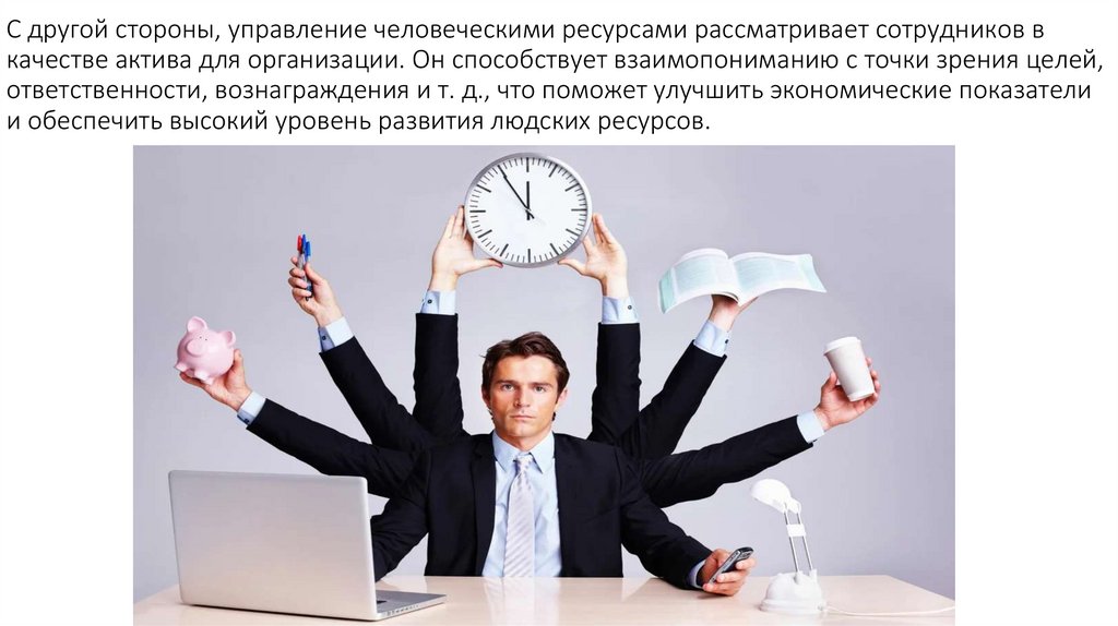 С другой стороны, управление человеческими ресурсами рассматривает сотрудников вкачестве актива для организации. Он способствует взаимопониманию с точки зрения целей,