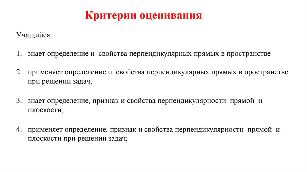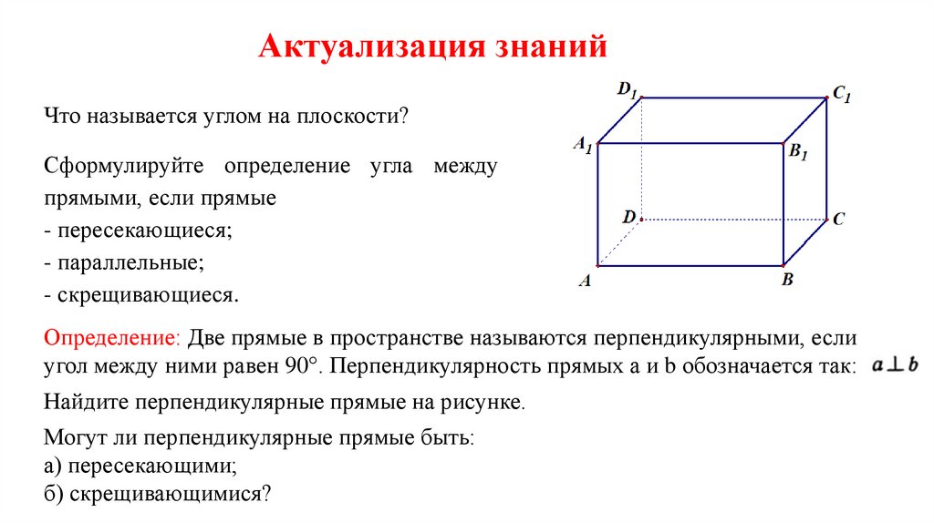 1. знает определение и свойства перпендикулярных прямых в пространстве