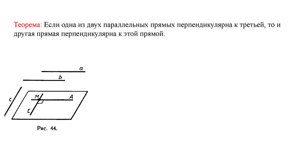 Теорема: Если одна из двух параллельных прямых перпендикулярна к третьей, то идругая прямая перпендикулярна к этой прямой.
