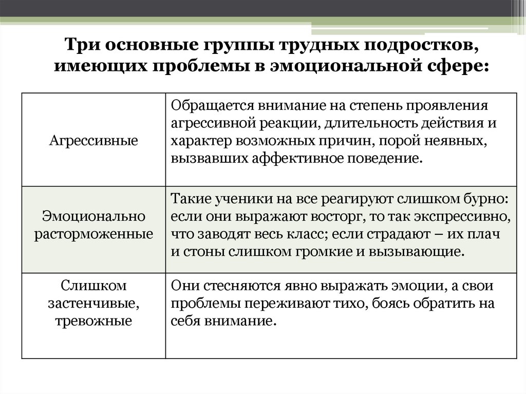 Три основные группы трудных подростков,имеющих проблемы в эмоциональной сфере: