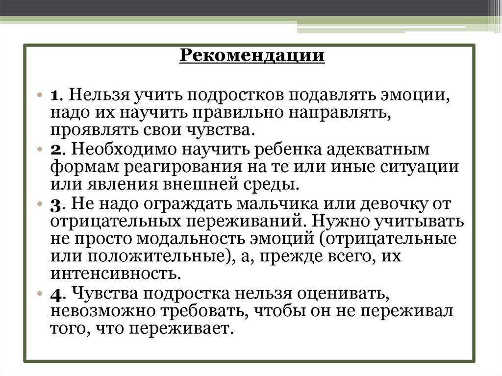 Рекомендации• 1. Нельзя учить подростков подавлять эмоции,