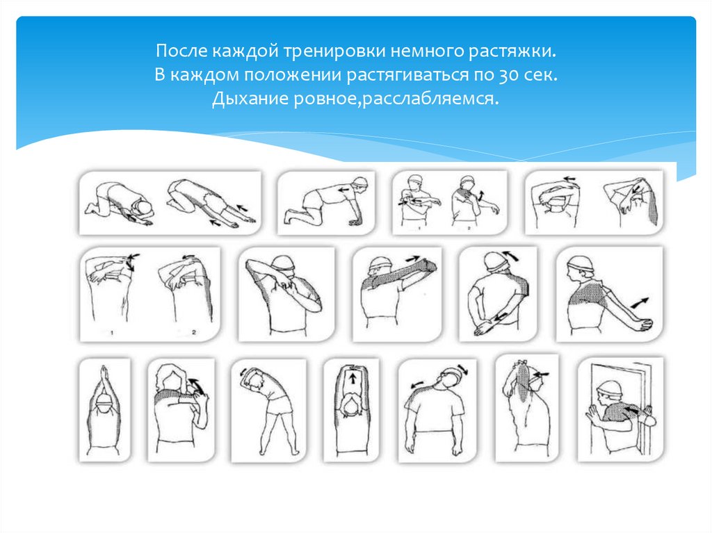 После каждой тренировки немного растяжки.В каждом положении растягиваться по 30 сек.