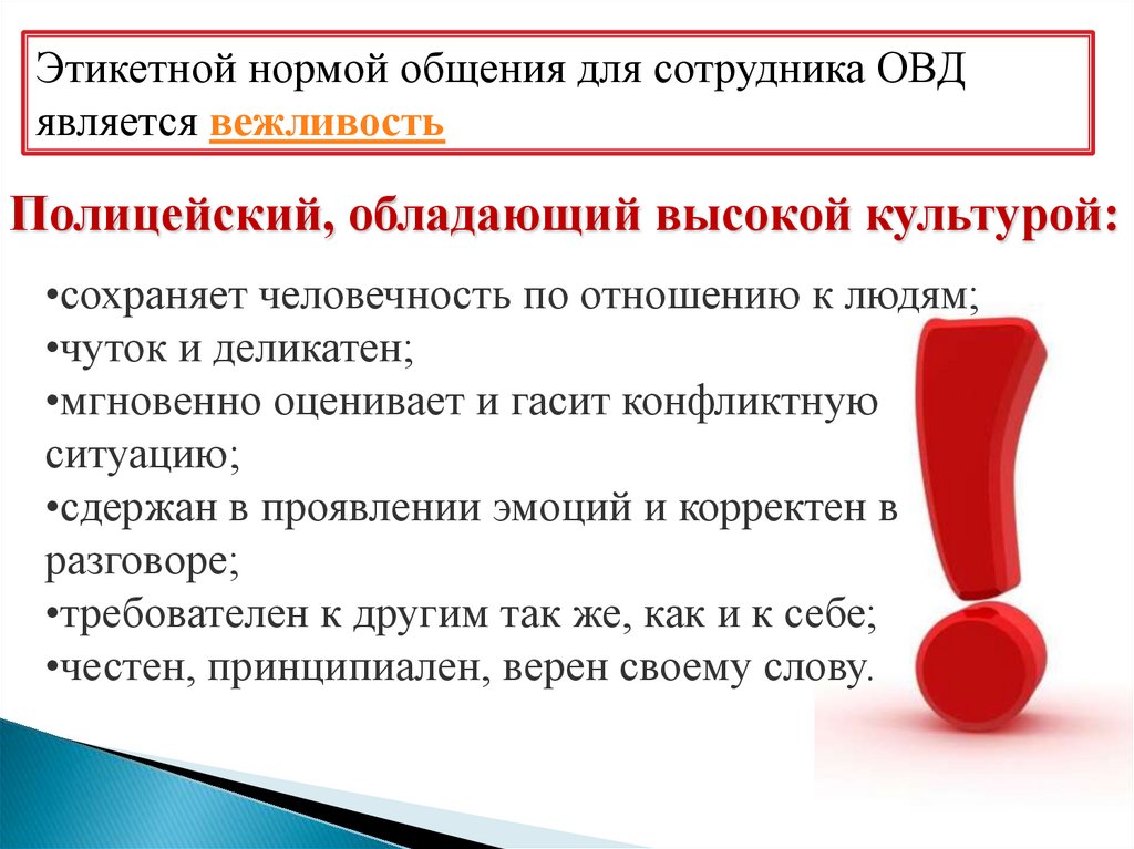 Этикетной нормой общения для сотрудника ОВДявляется вежливость