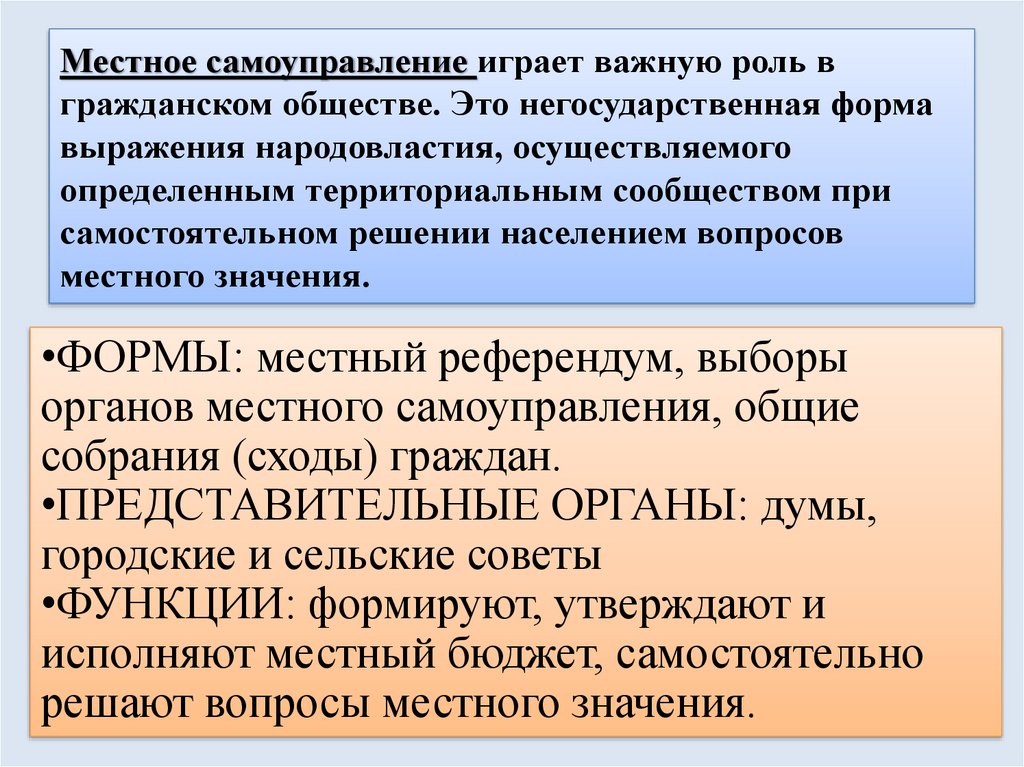 Местное самоуправление играет важную роль вгражданском обществе. Это негосударственная форма