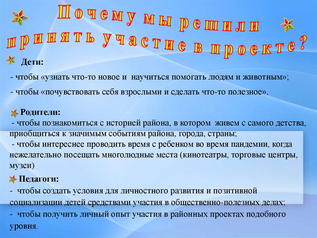 Дети:- чтобы «узнать что-то новое и научиться помогать людям и животным»;