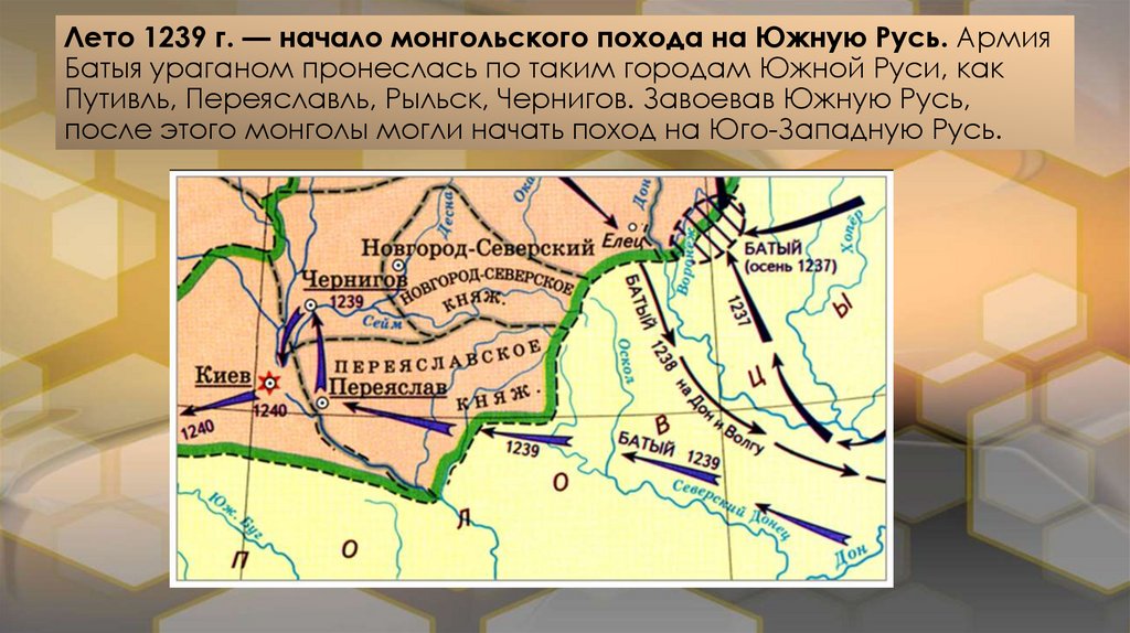 Лето 1239 г. — начало монгольского похода на Южную Русь. АрмияБатыя ураганом пронеслась по таким городам Южной Руси, как