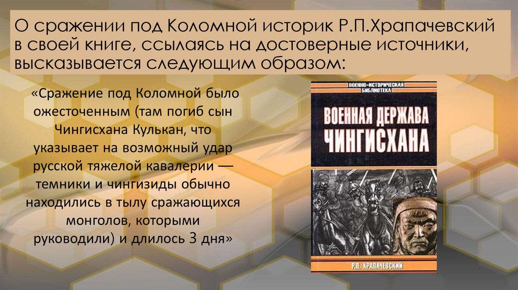 О сражении под Коломной историк Р.П.Храпачевскийв своей книге, ссылаясь на достоверные источники,
