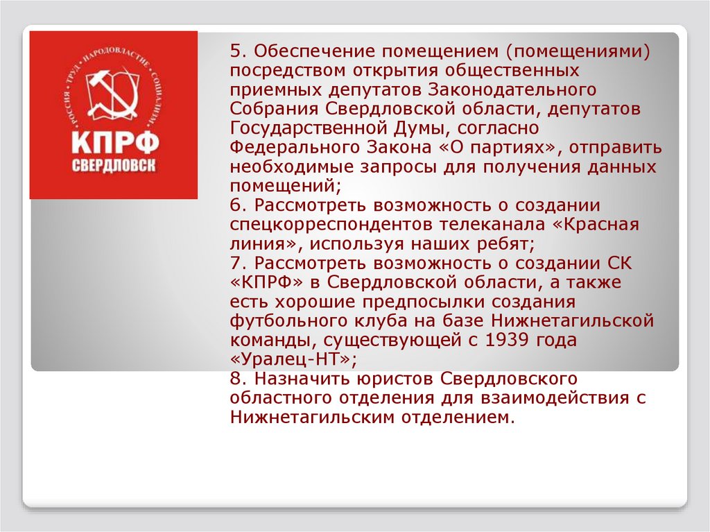 Наши предложения по улучшению работы:9. Совместно с обкомом КПРФ обеспечить