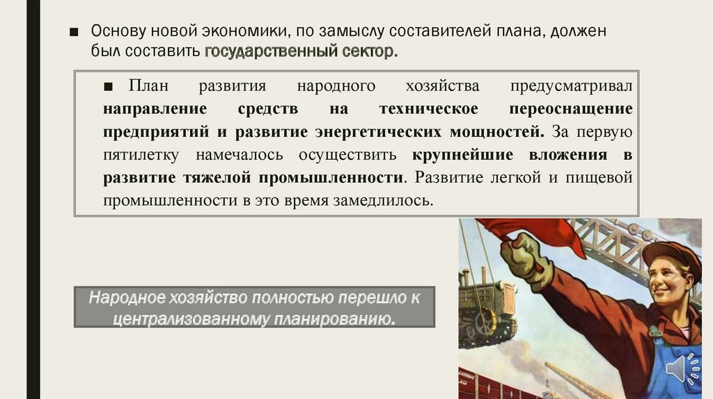 ■ Основу новой экономики, по замыслу составителей плана, долженбыл составить государственный сектор.