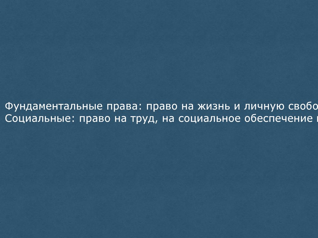 Фундаментальные права: право на жизнь и личную свободСоциальные: право на труд, на социальное обеспечение и