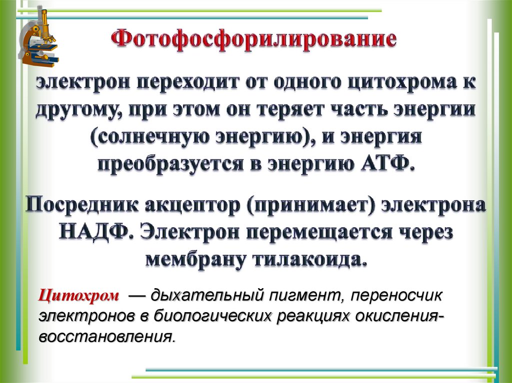 Цитохром — дыхательный пигмент, переносчикэлектронов в биологических реакциях окислениявосстановления.