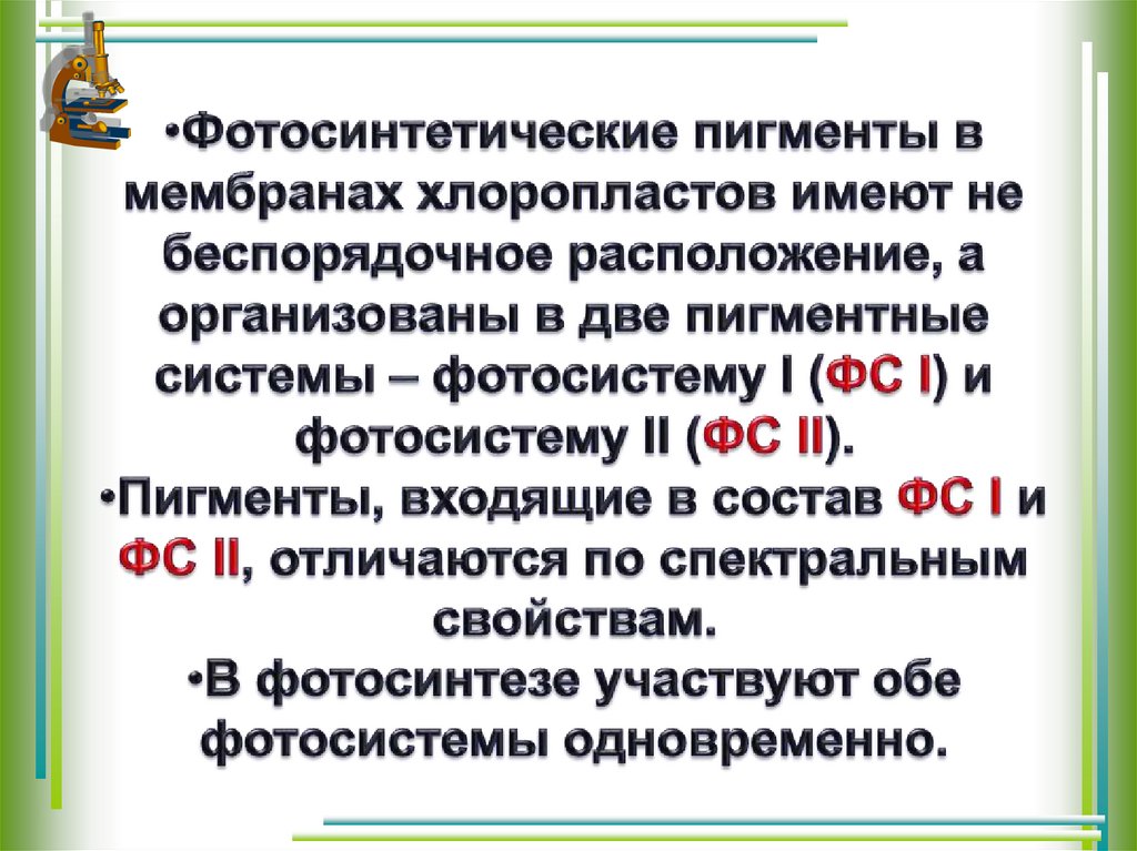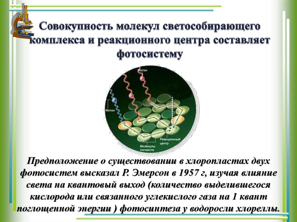 Предположение о существовании в хлоропластах двухфотосистем высказал Р. Эмерсон в 1957 г, изучая влияние