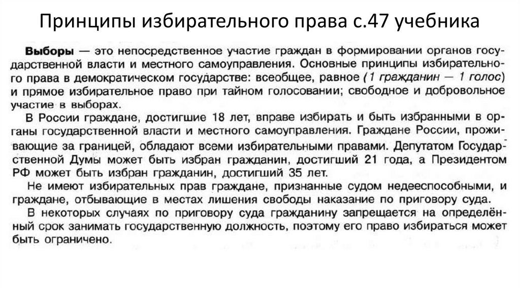 Принципы избирательного права с.47 учебника12.