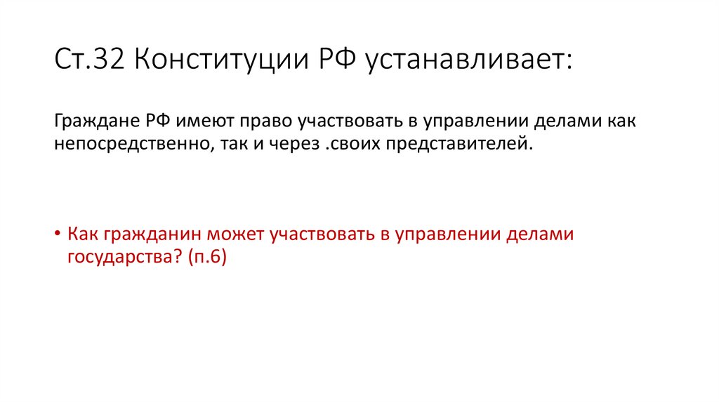 Ст.32 Конституции РФ устанавливает:Граждане РФ имеют право участвовать в управлении делами как