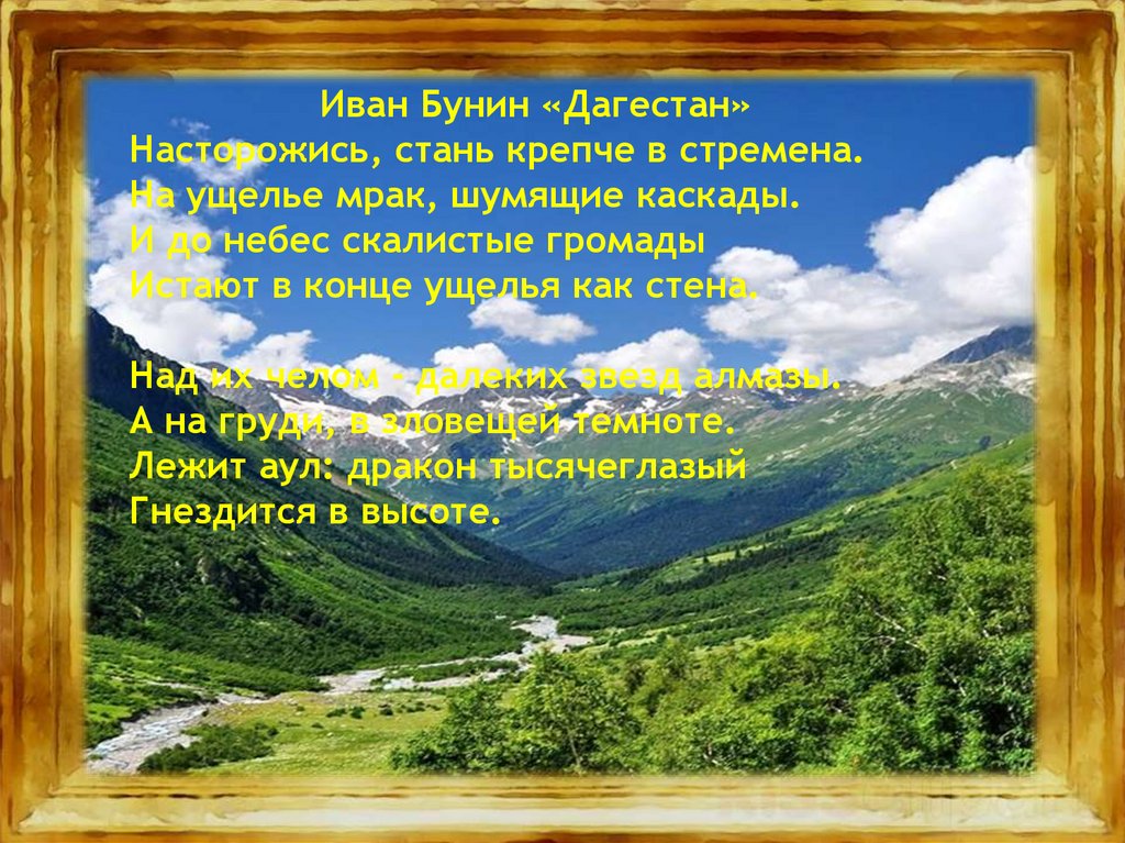 Иван Бунин «Дагестан»Насторожись, стань крепче в стремена.