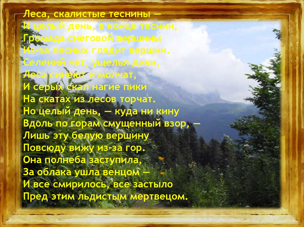 Леса, скалистые теснины —И целый день, в конце теснин,