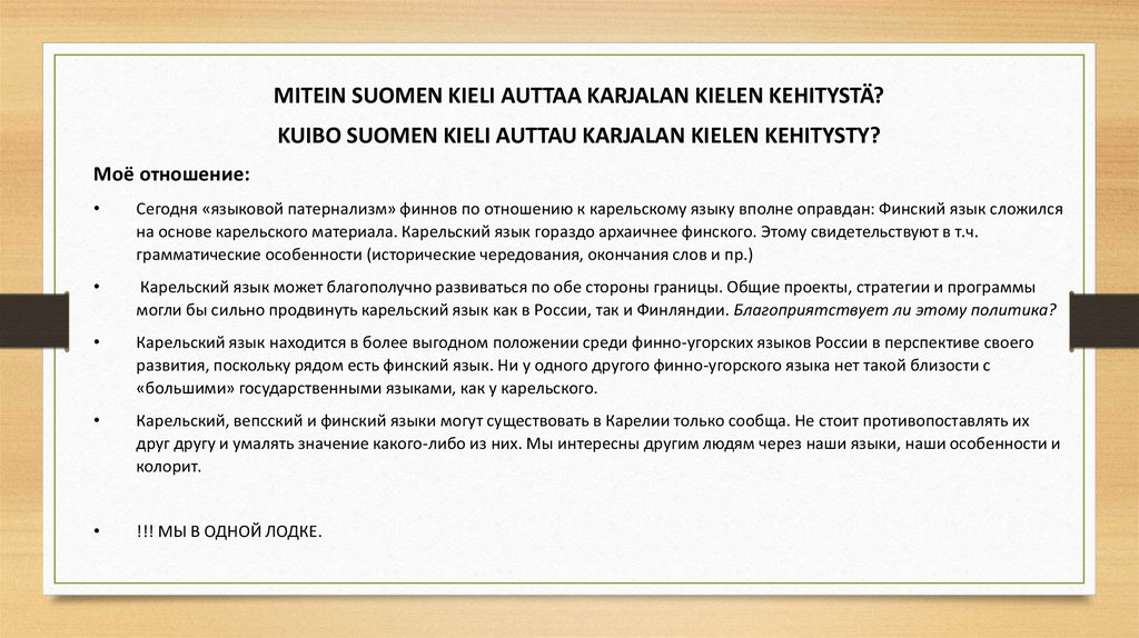 Сегодня «языковой патернализм» финнов по отношению к карельскому языку вполне оправдан: Финский язык сложился