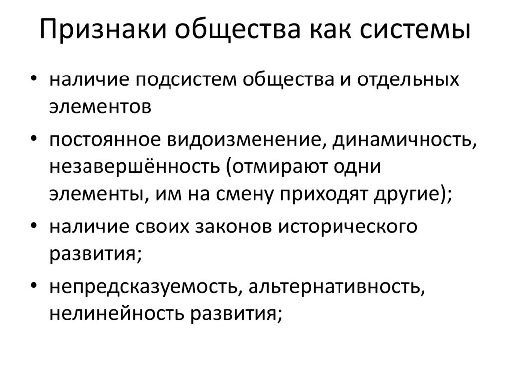 Признаки общества как системы• наличие подсистем общества и отдельных