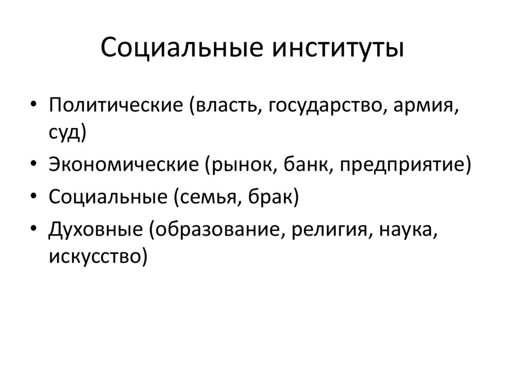 Социальные институты• Политические (власть, государство, армия,
