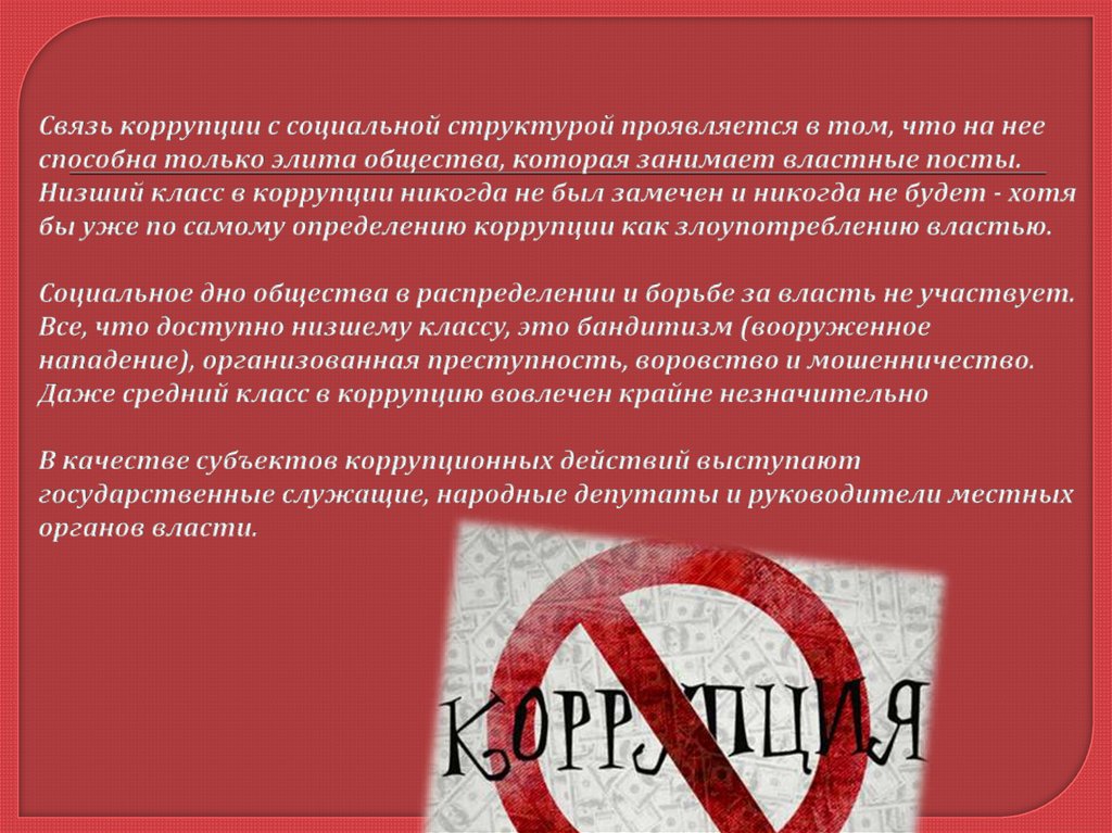Суть коррупции как социального явления заключается в разложенииструктуры власти, перераспределении ресурсов в пользу тех или иных групп,