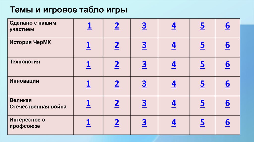 Темы и игровое табло игрыСделано с нашим