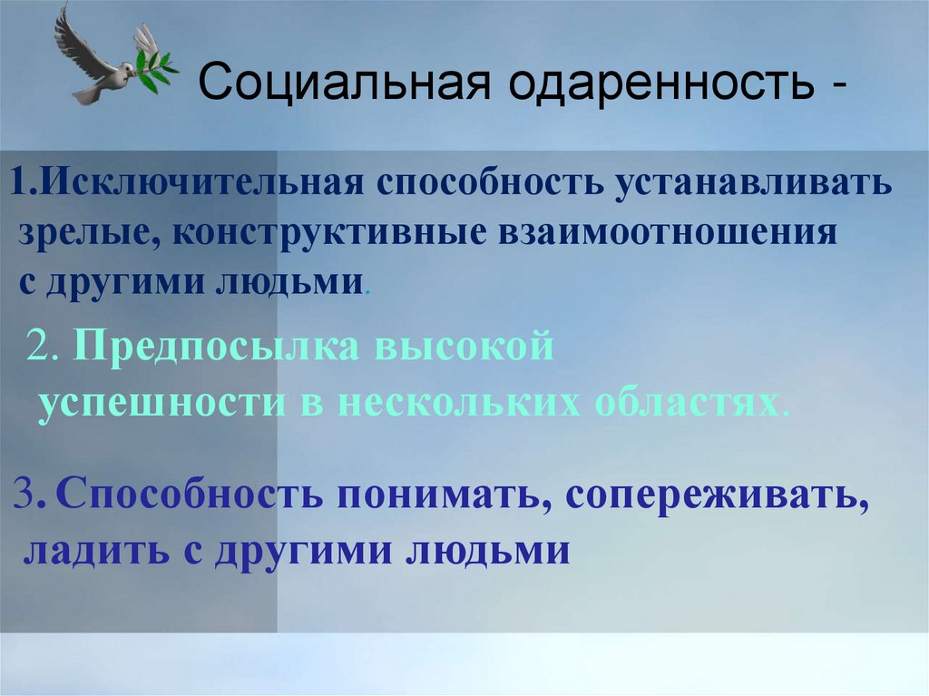 Социальная одаренность 1.Исключительная способность устанавливатьзрелые, конструктивные взаимоотношения