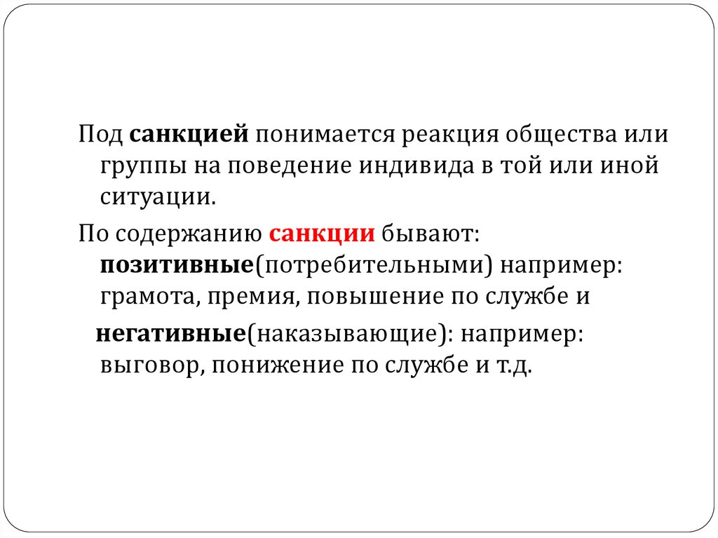 Под санкцией понимается реакция общества илигруппы на поведение индивида в той или иной