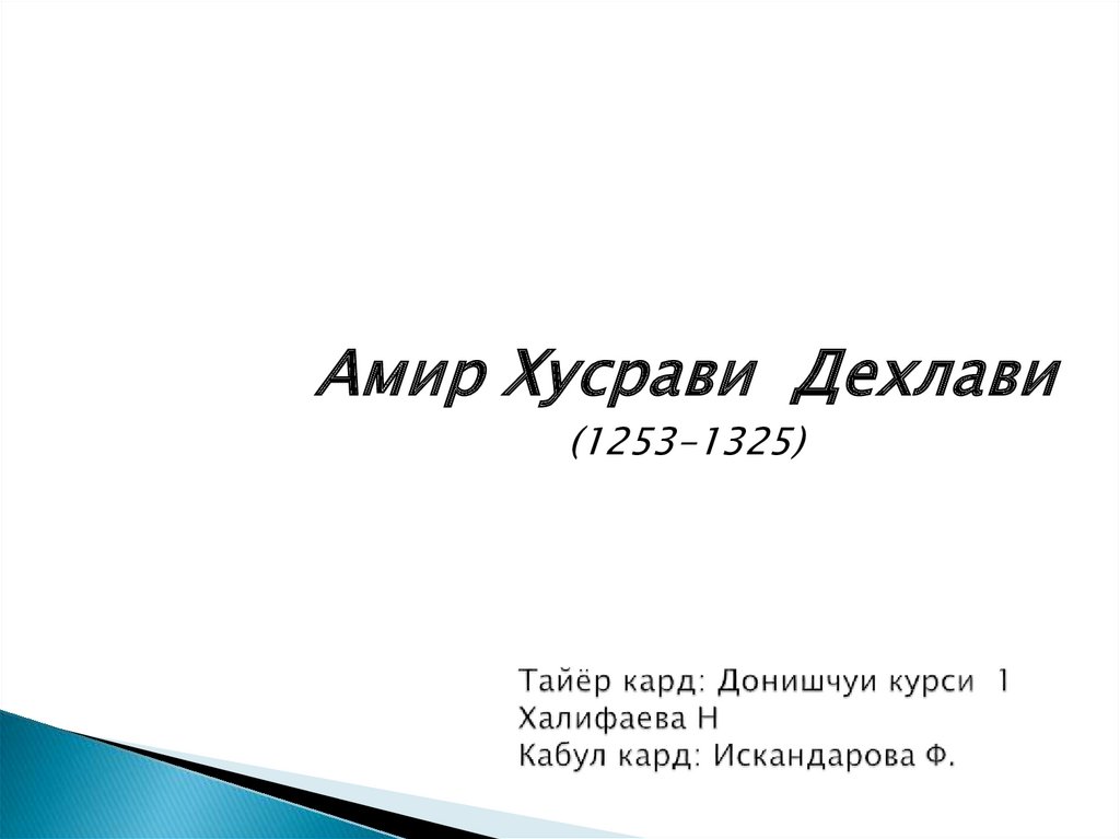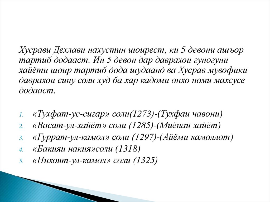 Хусрави Дехлави нахустин шоирест, ки 5 девони ашъортартиб додааст. Ин 5 девон дар даврахои гуногуни
