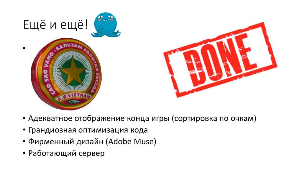 Ещё и ещё!• Адекватное отображение конца игры (сортировка по очкам)