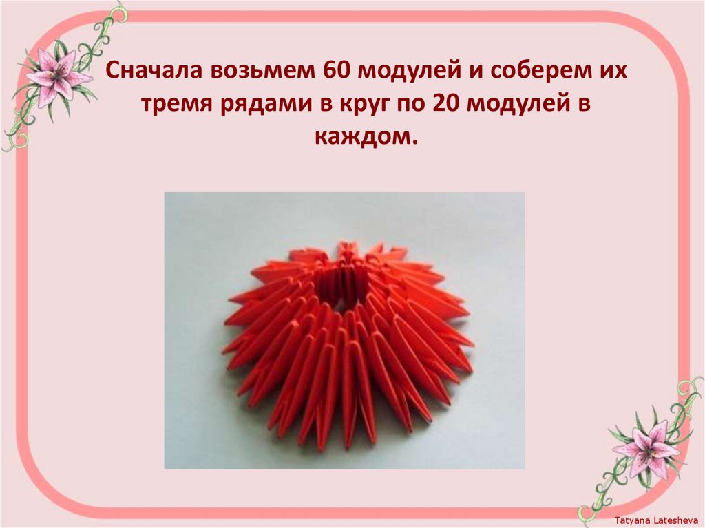 Сначала возьмем 60 модулей и соберем ихтремя рядами в круг по 20 модулей в