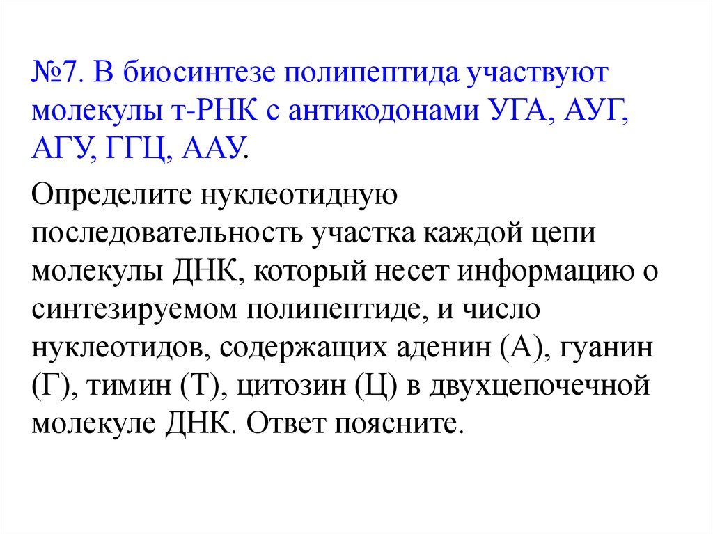 №7. В биосинтезе полипептида участвуютмолекулы т-РНК с антикодонами УГА, АУГ,