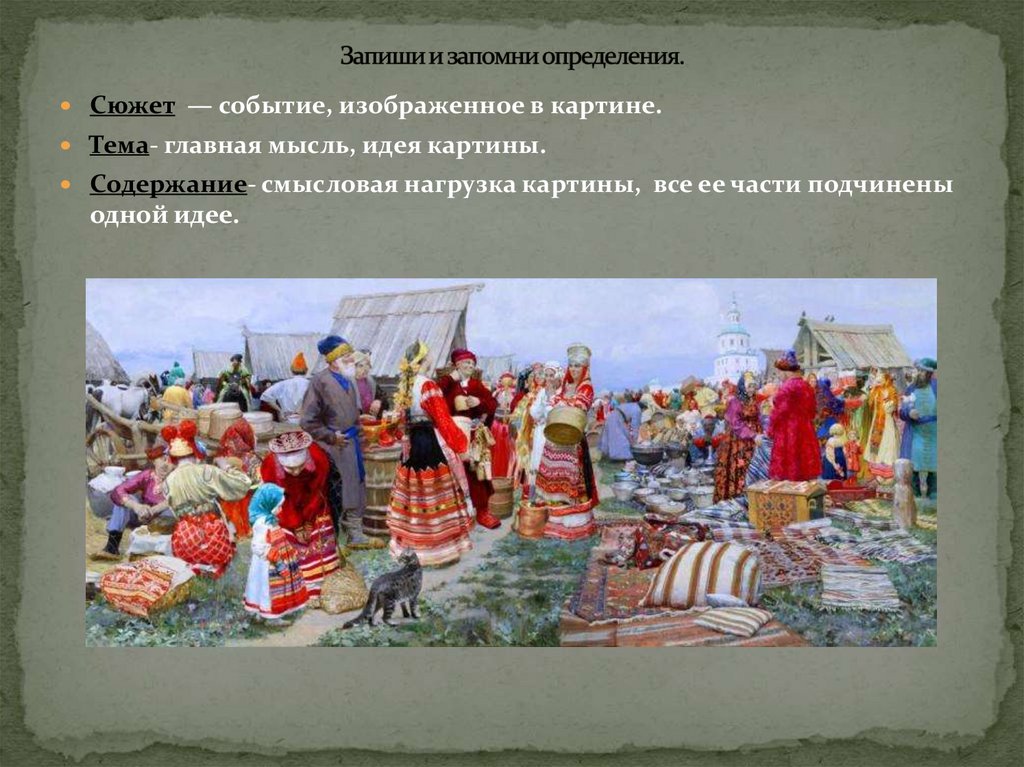 Сюжет — событие, изображенное в картине.Тема- главная мысль, идея картины.