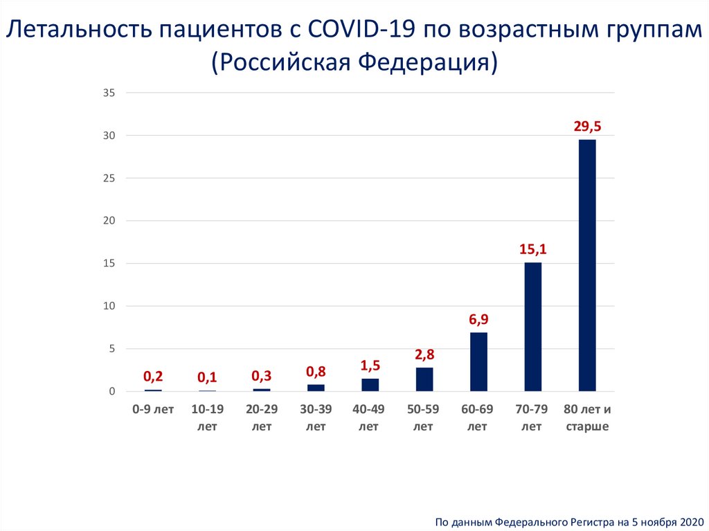 Летальность пациентов с COVID-19 по возрастным группам(Российская Федерация)