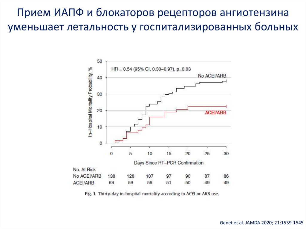 Прием ИАПФ и блокаторов рецепторов ангиотензинауменьшает летальность у госпитализированных больных