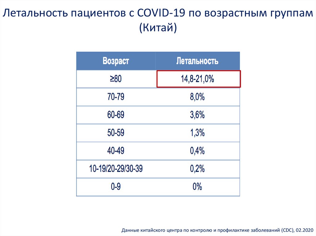 Летальность пациентов с COVID-19 по возрастным группам(Китай)