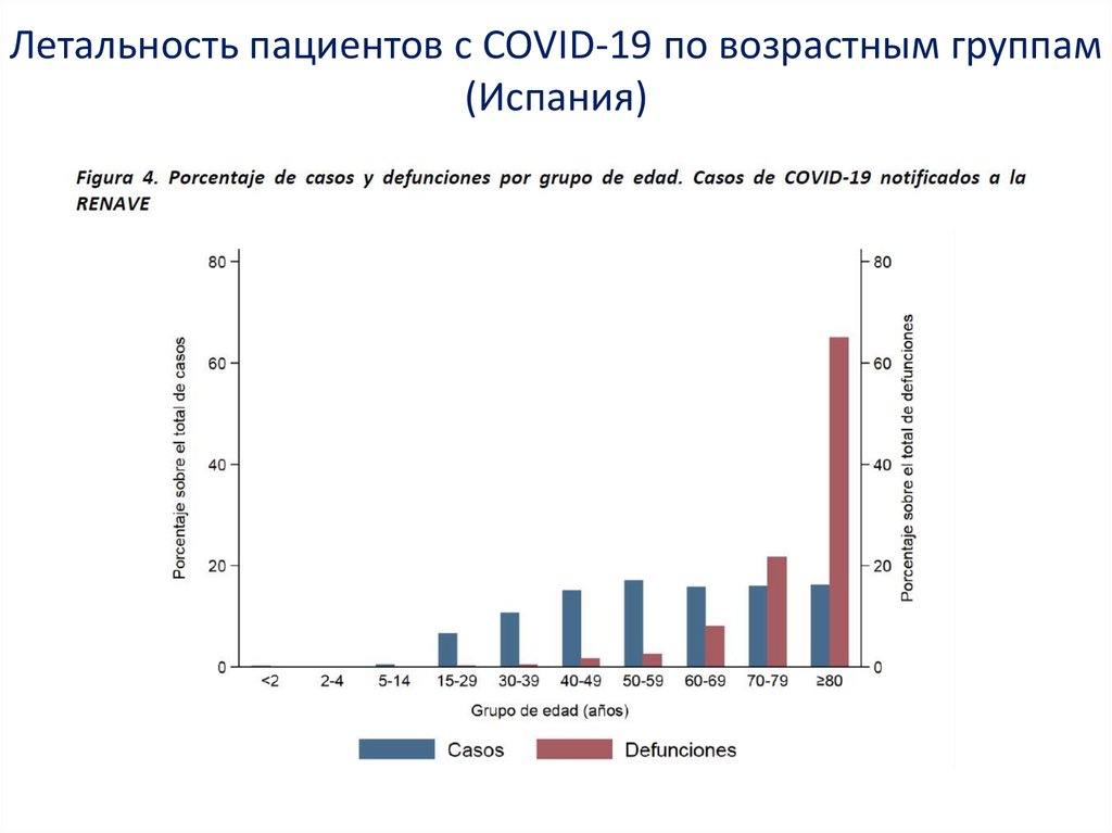 Летальность пациентов с COVID-19 по возрастным группам(Испания)