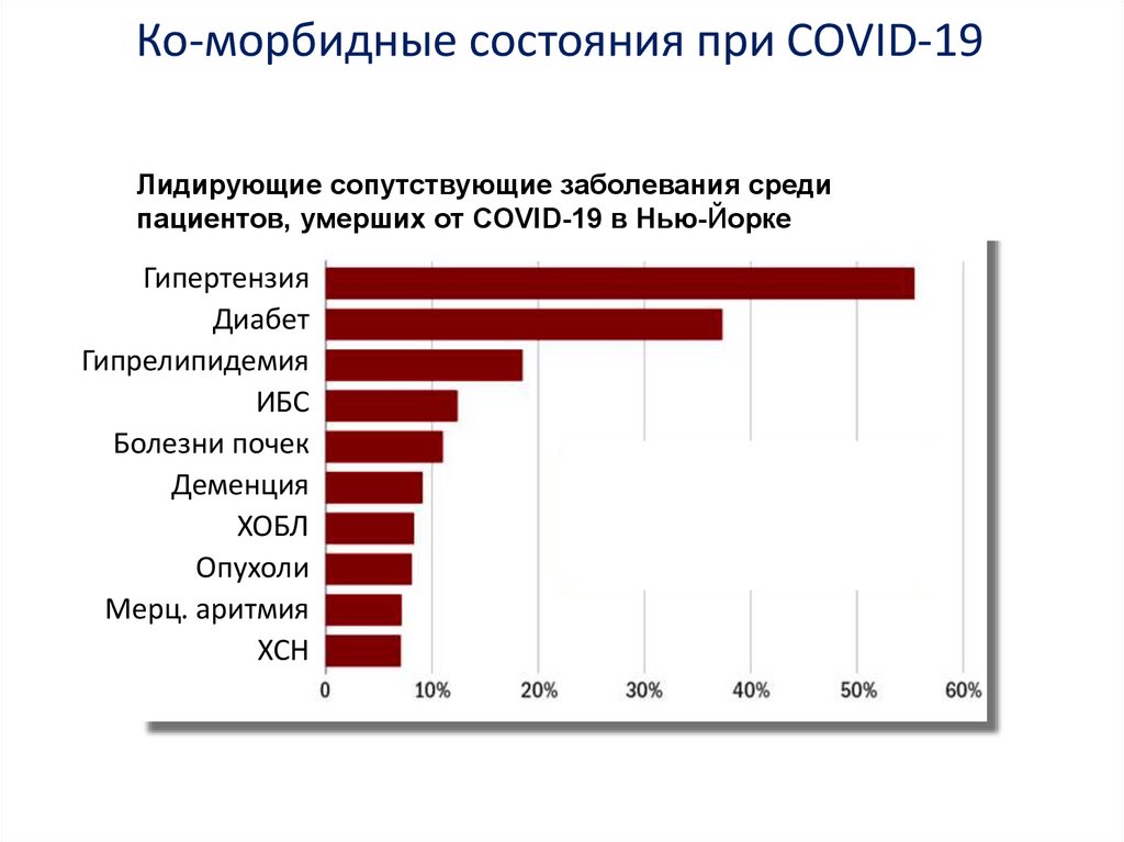 Ко-морбидные состояния при COVID-19Лидирующие сопутствующие заболевания среди