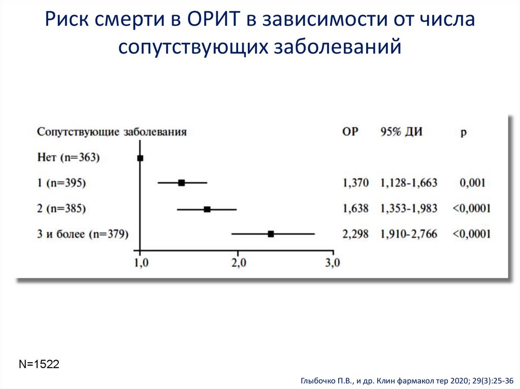 Риск смерти в ОРИТ в зависимости от числасопутствующих заболеваний