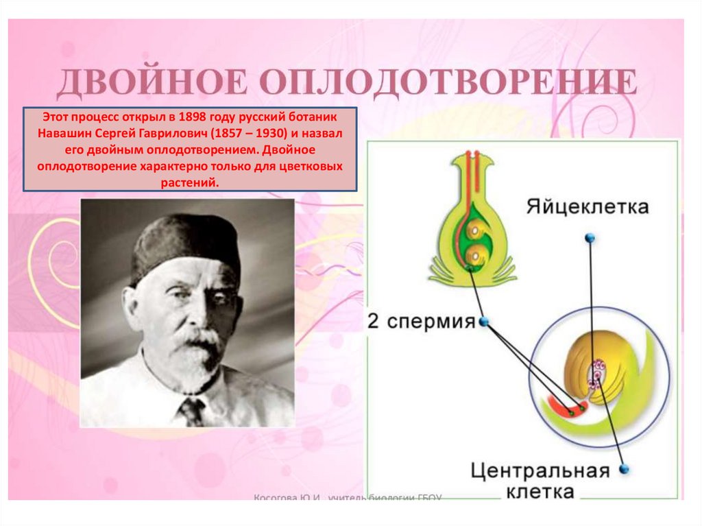 Этот процесс открыл в 1898 году русский ботаникНавашин Сергей Гаврилович (1857 – 1930) и назвал