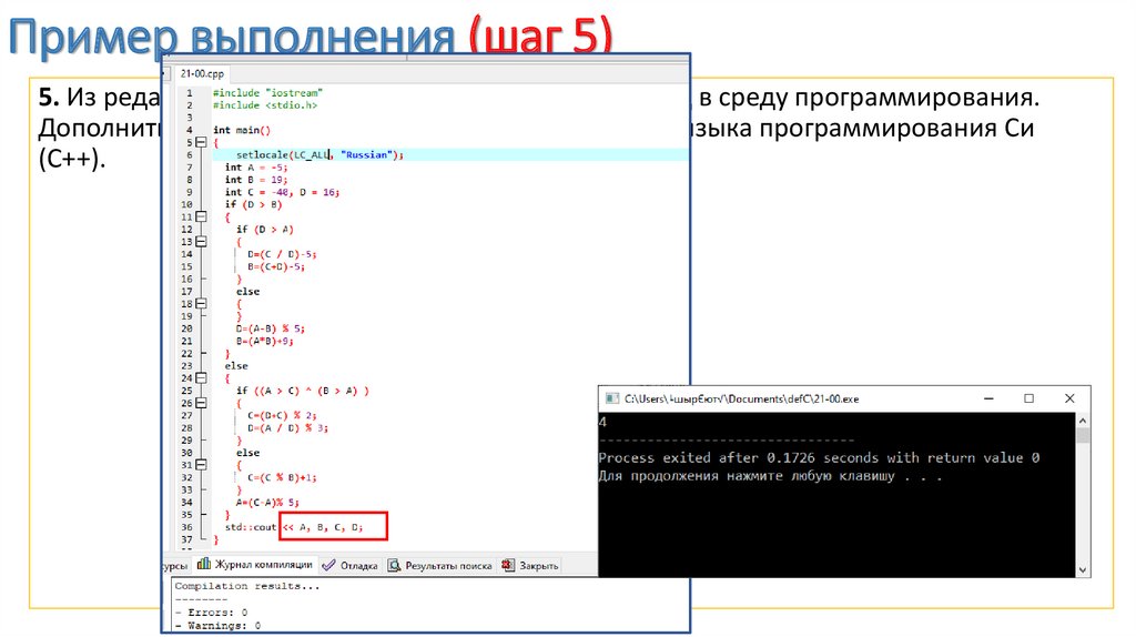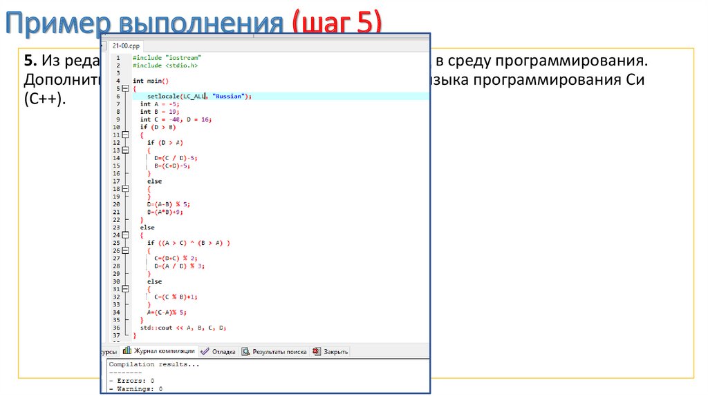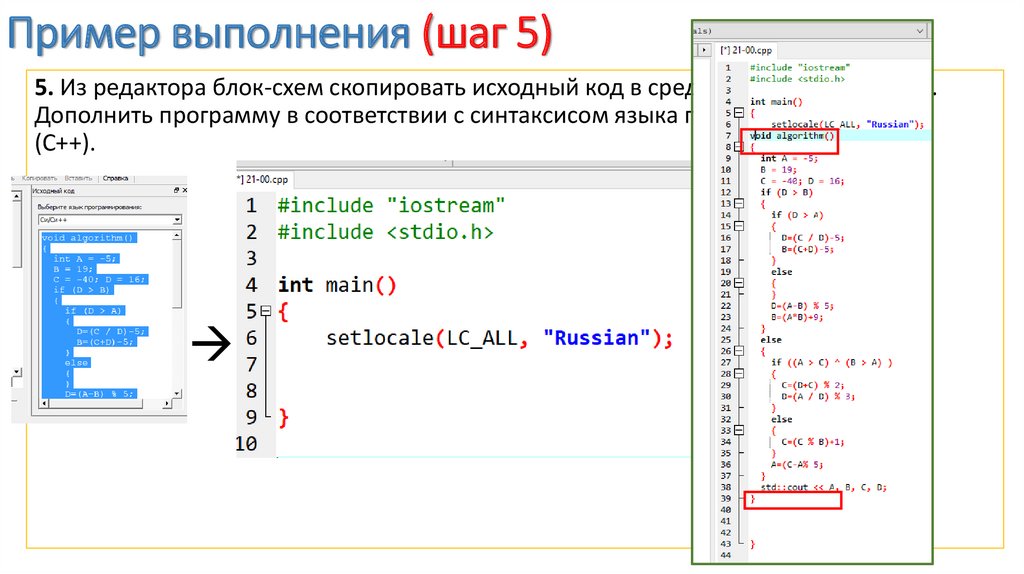 Пример выполнения (шаг 6)5. Из редактора блок-схем скопировать исходный код в среду программирования.