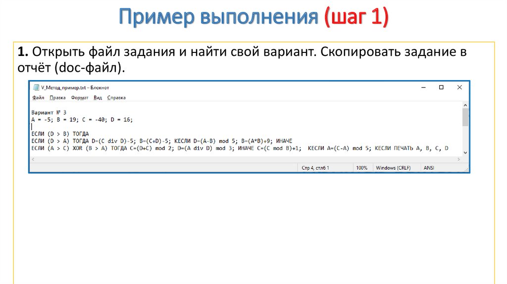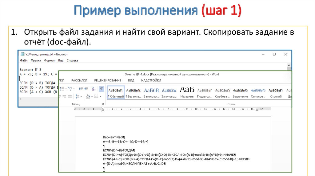 Пример выполнения (шаг 1)1. Открыть файл задания и найти свой вариант. Скопировать задание в