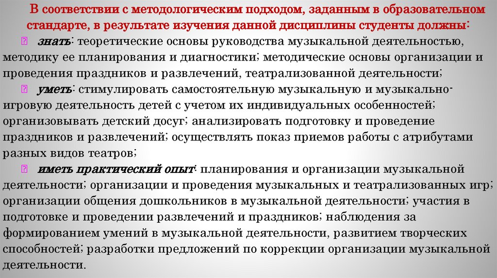 В соответствии с методологическим подходом, заданным в образовательномстандарте, в результате изучения данной дисциплины студенты должны:
