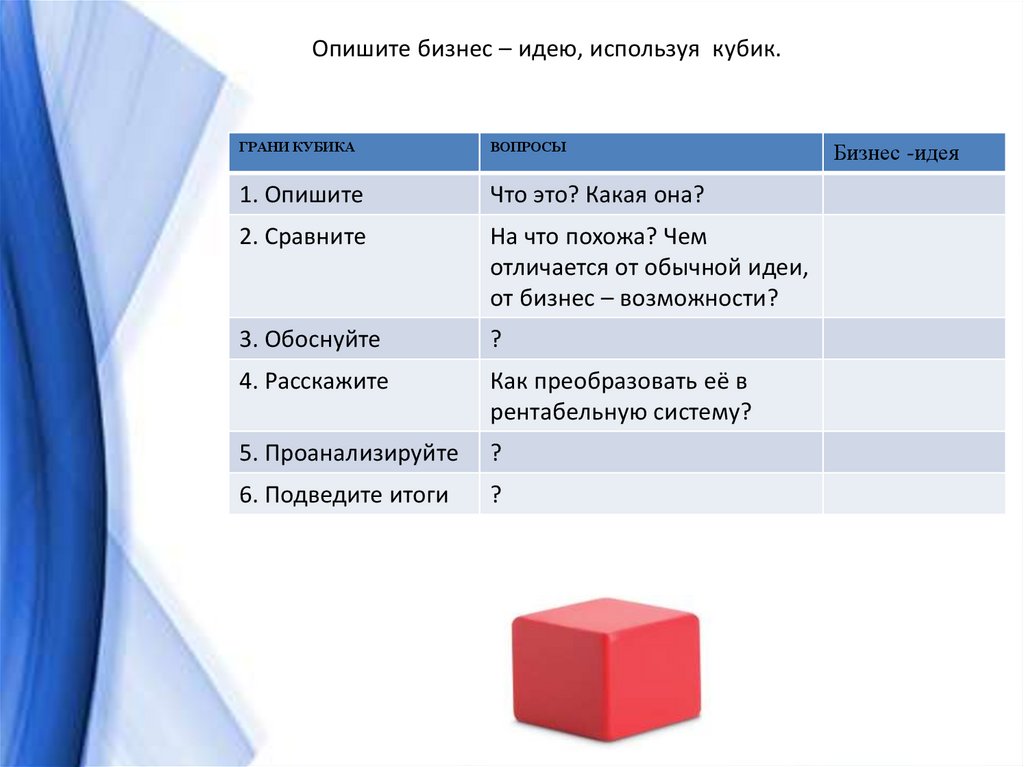 Опишите бизнес – идею, используя кубик.ГРАНИ КУБИКА