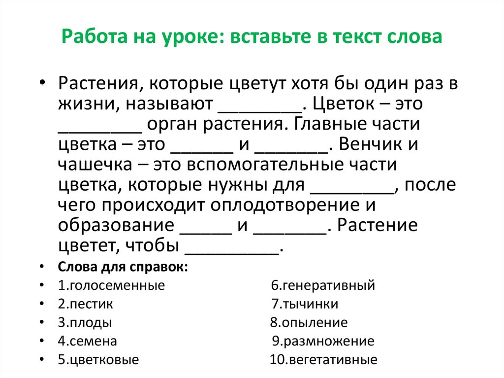 Работа на уроке: вставьте в текст слова• Растения, которые цветут хотя бы один раз в