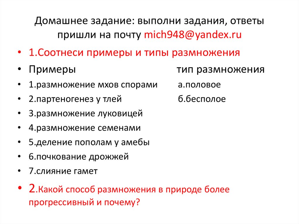 Домашнее задание: выполни задания, ответыпришли на почту mich948@yandex.ru