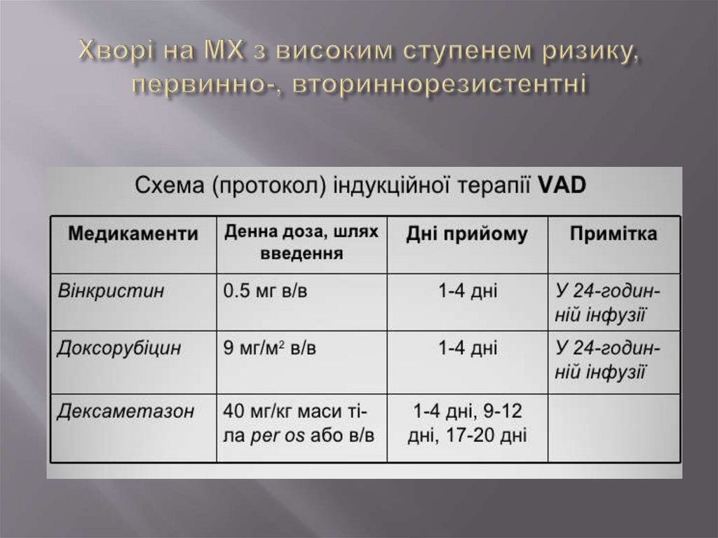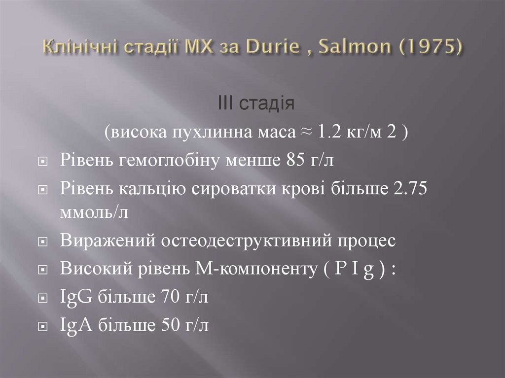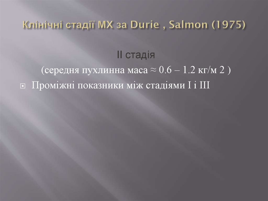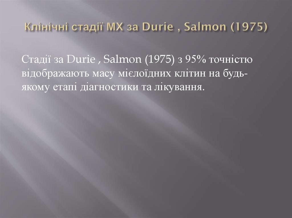 Стадії за Durie , Salmon (1975) з 95% точністювідображають масу мієлоїдних клітин на будьякому етапі діагностики та лікування.