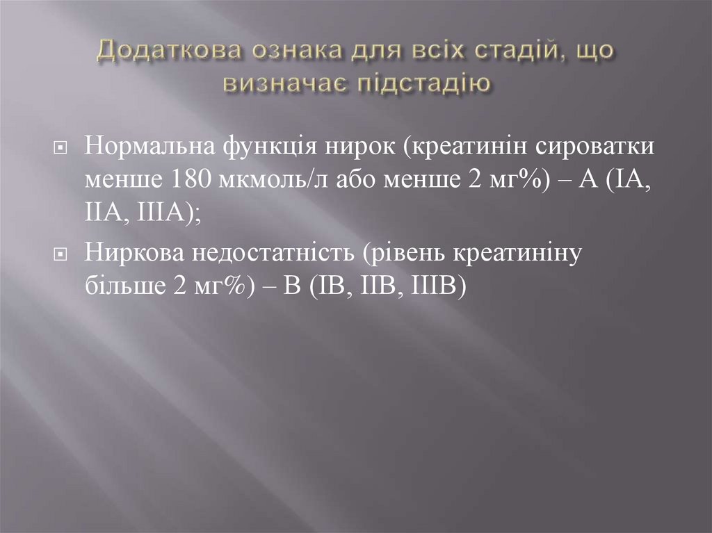 Нормальна функція нирок (креатинін сироваткименше 180 мкмоль/л або менше 2 мг%) – А (ІА,