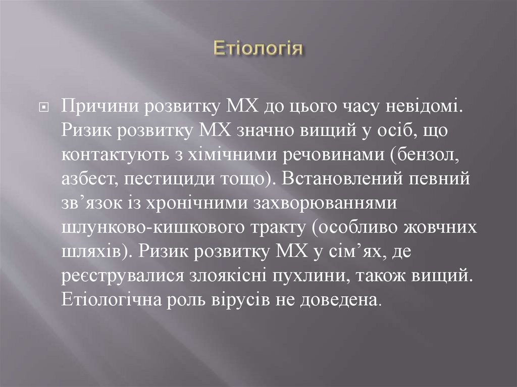 Причини розвитку МХ до цього часу невідомі.Ризик розвитку МХ значно вищий у осіб, що