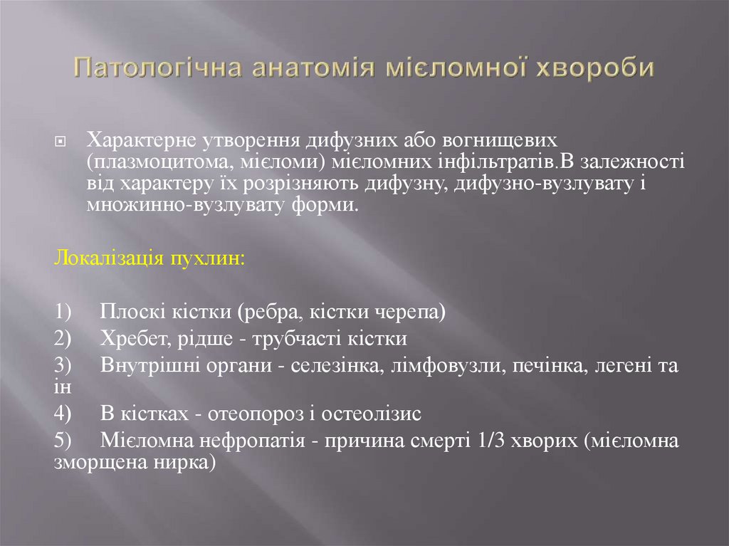 Характерне утворення дифузних або вогнищевих(плазмоцитома, мієломи) мієломних інфільтратів.В залежності